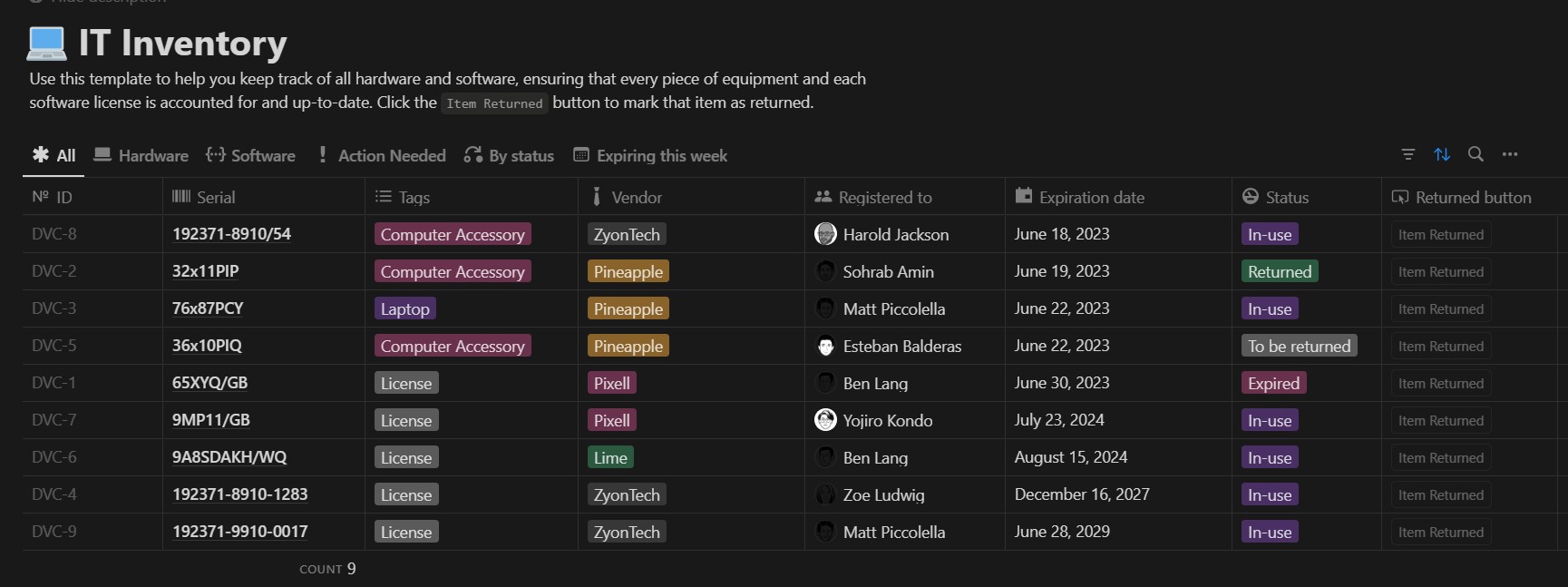 - IT Inventory :筆者用的是這款,有序號、標籤、廠商、人員、有效期、狀態等等,是個簡單又清楚的模板,上方區塊還能根據硬體、軟體、狀態、即將到期來篩選,是算滿好用的。https://www.notion.so/templates/it-inventory